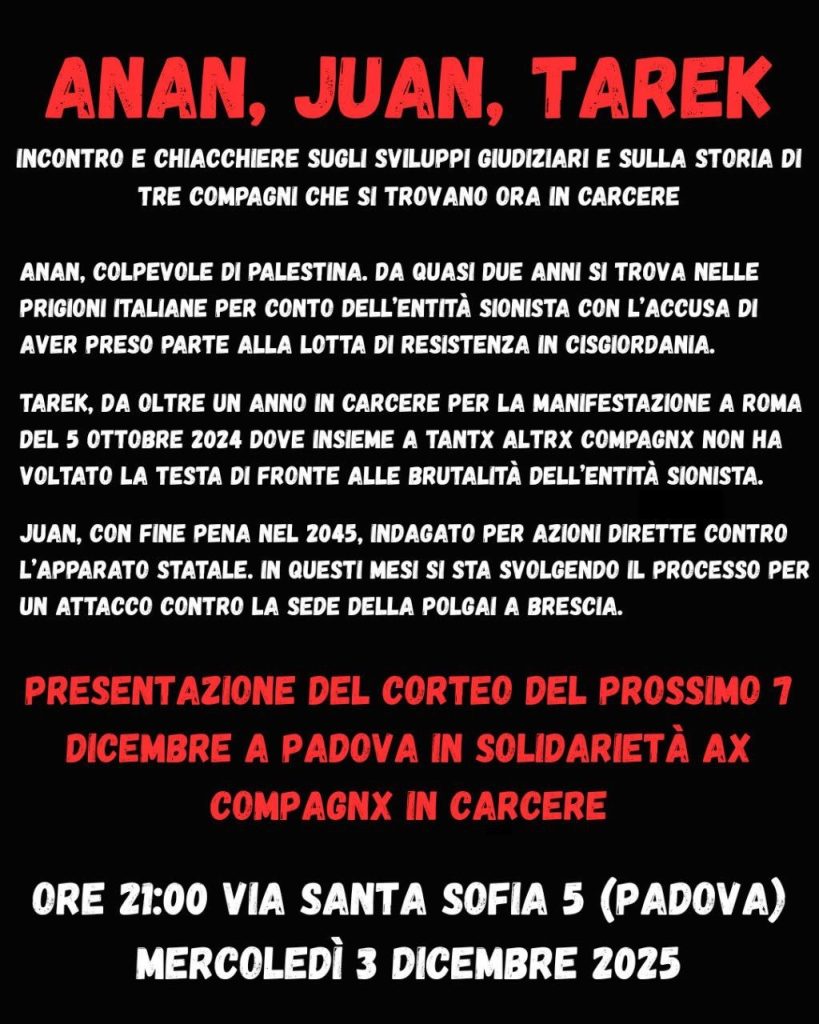 • Padova, 7 dicembre: Con Anan, Juan, Tarek, solidarietà! Corteo in città (3 dicembre, presentazione del corteo)