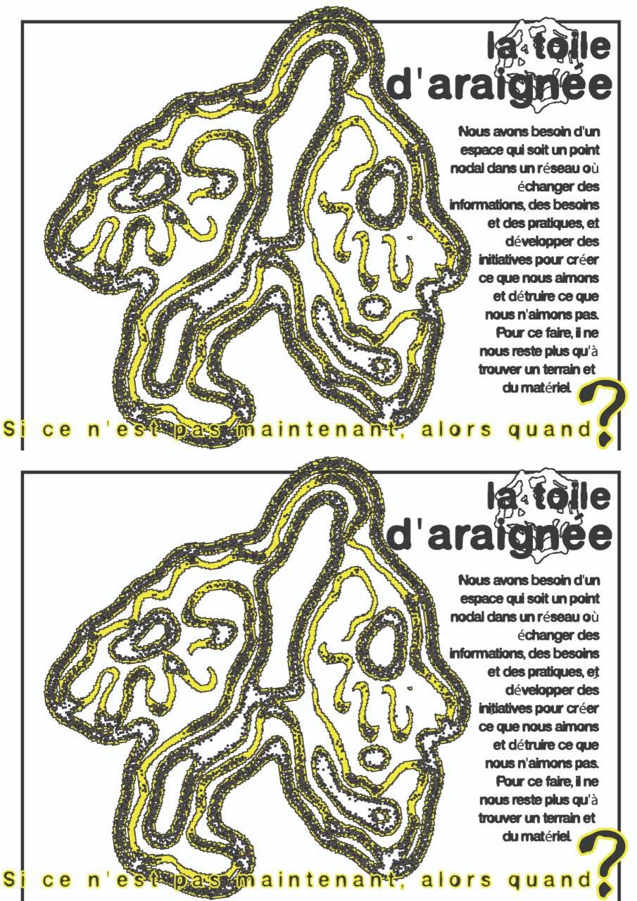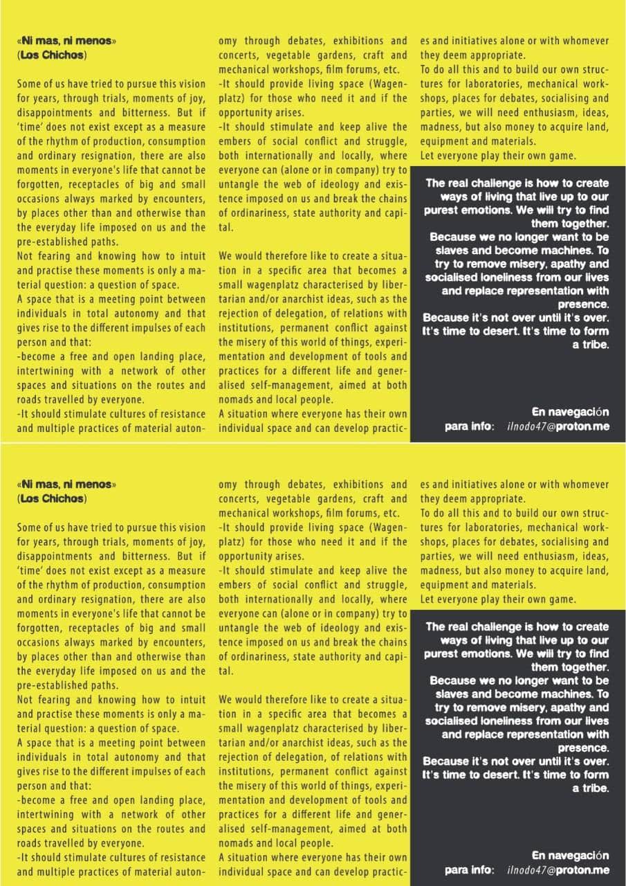linee di vita e di lotta, e densità sociali da mappare,attraversare e saper maneggiare con perizia. Procedere a zigzag tessendo trame, orditi e complicità è gioco con le molteplici curvature degli spazi e dei tempi, sia individuali che sociali. È una questione di volontà e di attrezzi che possano servirci ad agganciare occasioni che si profilano nella navigazione, come a saperci sganciare da ordinarietà, autoritarismi e dalla forza di gravità sociale che ci tiene schiacciati al suolo del sempre identico e della solitudine digitalizzata. Per imbastire trame, momenti e mezzi per navigare necessitiamo di spazi e di materiali sulle rotte dove poter sperimentare forme di vita altra e di lotta. Stiamo provando a dare presa e corpo ad un nostro sogno: un punto d approdo sulle strade dove poterci incontrare e respirare assieme. Siamo una piccola tribù di nomadi e seminomadi delle Terre occidentali d’ Europa. Qui, nella zona di agen, stiamo cercando un terreno dove provare a dare vita a tutto ciò.
