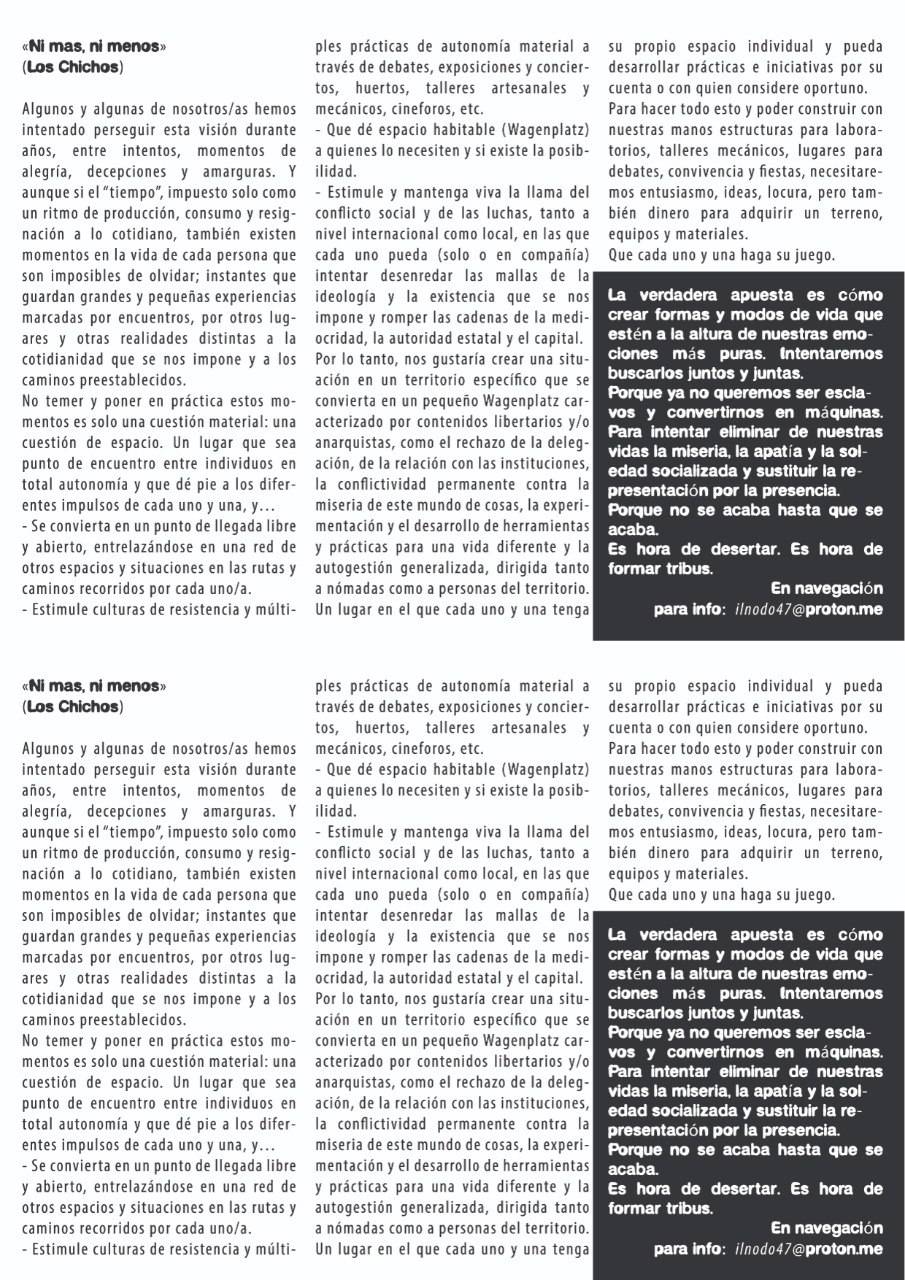 Líneas de vida y de lucha, y densidades sociales que hay que cartografiar, atravesar y saber manejar con destreza. Avanzar en zigzag tejiendo tramas, urdimbres y complicidades es un juego con las múltiples curvaturas de los espacios y los tiempos, tanto individuales como sociales. Es una cuestión de voluntad y de herramientas que nos sirvan para aprovechar las oportunidades que se perfilan en la navegación, así como para saber desprendernos de la mediocridad, los autoritarismos y la fuerza de gravedad social que nos mantiene aplastados al suelo de lo siempre igual y de la soledad digitalizada. Para tejer tramas, momentos y medios para navegar, necesitamos espacios y materiales en las rutas donde podamos experimentar otras formas de vida y de lucha. Estamos intentando hacer realidad nuestro sueño: un lugar en las carreteras donde poder encontrarnos y respirar juntos. Somos una pequeña tribu de nómadas y seminómadas de las tierras occidentales de Europa. Aquí, en la zona de Agen, estamos buscando un terreno donde intentar dar vida a todo esto.
