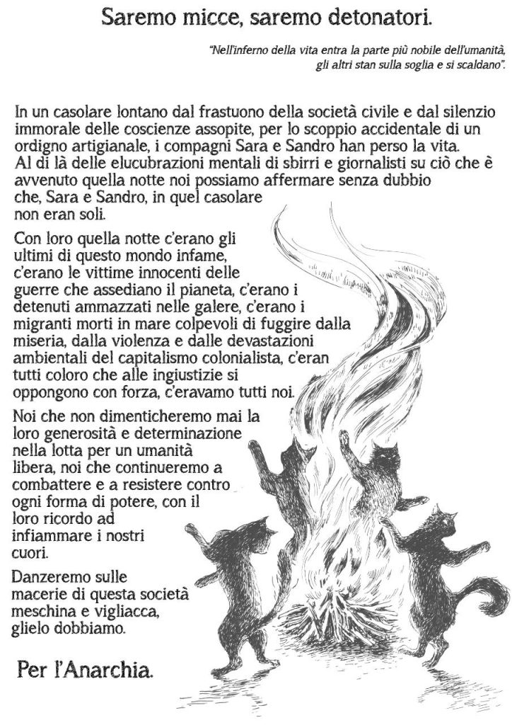 Là on le dit sans plonger absolument dans la rhétorique: les deux anarchistes qui ont été retrouvés morts suite à l’effondrement d’un chalet à Rome, Sara Ardizzone e Alessandro Mercogliano, sont parmi nos compagnons fraternels, que nous sommes fiers d’avoir comme compagnons. Les journaleux mercenaires, dont le papier de rebut nous a fait apprendre la nouvelle, parlent à maintes reprises de l’explosion d’un engin. Les inquiètes prises de distance, toujours utiles à s’assurer une sécurité honteuse, ne nous appartiennent pas. On a l’habitude à ne pas croire un mot de ces prononcés par la machine de propagande, mais au cas où il y aurait un brin de vérité dans les informations divulguées, on ne peut pas s’empecher de nous attarder sur un fait fondamental: Sara et Sandro sont morts au combat, en luttant. La guerre social n’est pas une comédie, ni un train de vie ni une sous-culture. C’est avant tout une guerre. Sara et Sandro sont un exemple lumineux de l’indissociable combinaison entre pensée et action qui inspire l’anarchisme, ils auront été des révolutionnaires jusqu’au dernier instant de leur vies, et dans la mort.