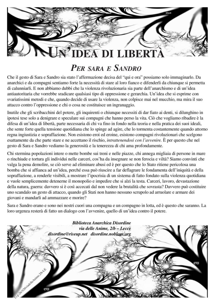 Inutile che gli scribacchini del potere, gli inquirenti o chiunque necessiti di dar fiato ai denti, si dilunghino in ipotesi tese solo a denigrare e speculare sui compagni che hanno perso la vita. Ciò che vogliamo ribadire è la difesa di un’idea di libertà, parte necessaria di chi va fino in fondo nella teoria e nella pratica dei suoi ideali, che sente forte quella tensione quotidiana che lo spinge ad agire, che lo tormenta costantemente quando attorno regna ingiustizia e sopraffazione. Non esistono eroi ed eroine, esistono compagni rivoluzionari che scelgono esattamente da che parte stare e ne accettano il rischio, intrattenendosi con l’avvenire. È per questo che nel gesto di Sara e Sandro vediamo la generosità e la tenerezza di chi ama profondamente.